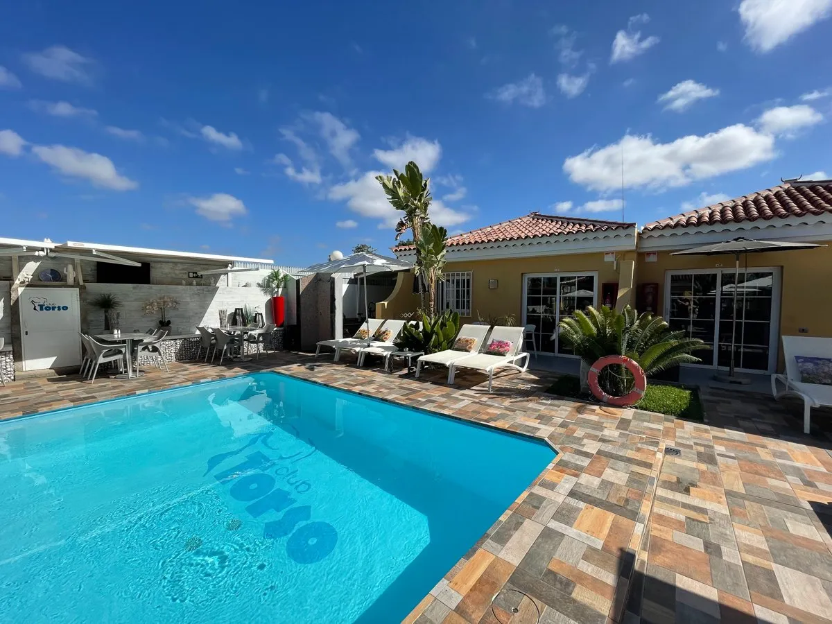 Gran Canaria Gay resorts: Club Torso is centrally located in Maspalomas, in an oasis of botanical planting and tropical palms, a stone's throw from shopping malls, supermarket and by taxi within three minutes at the Yumbo Center in Playa del Inglés.
