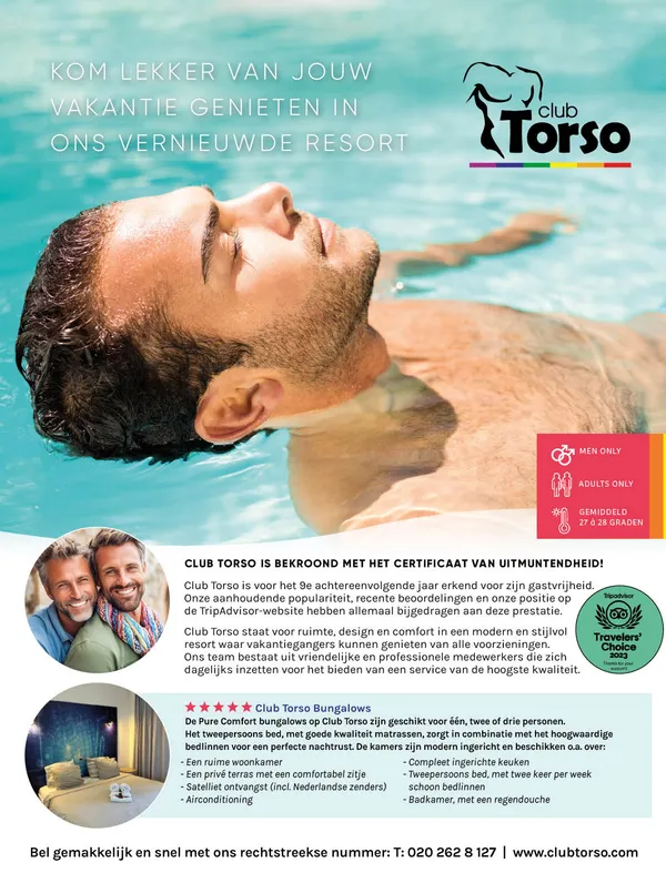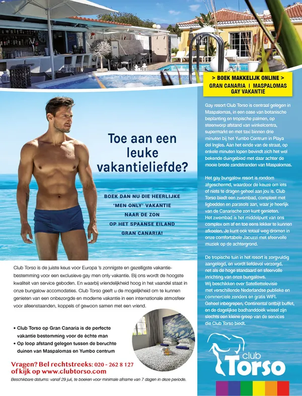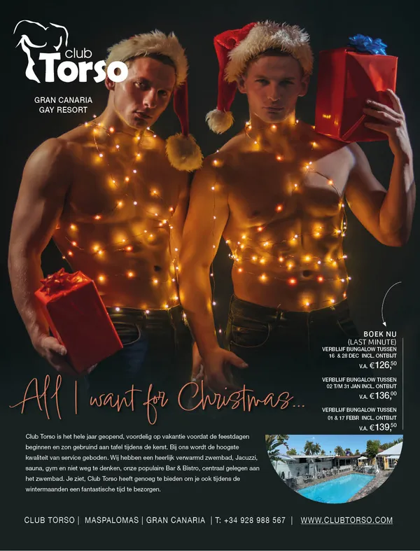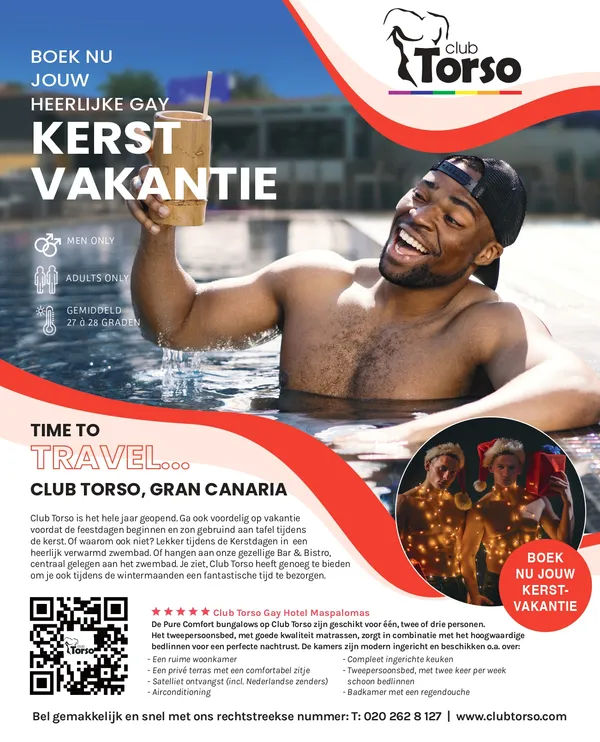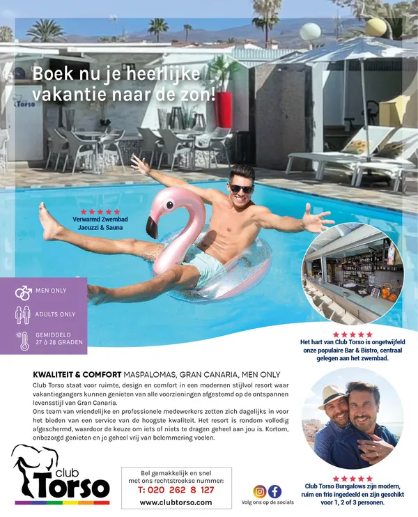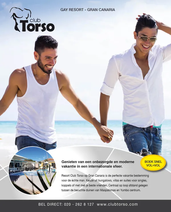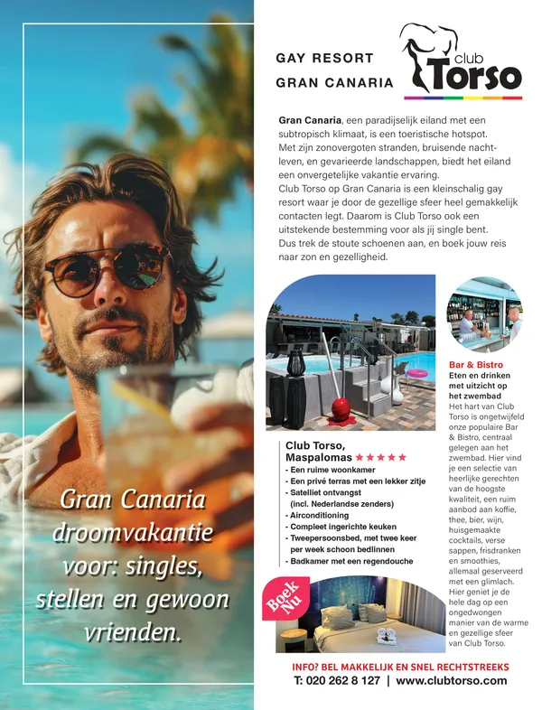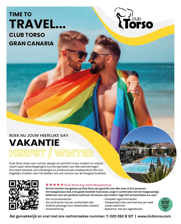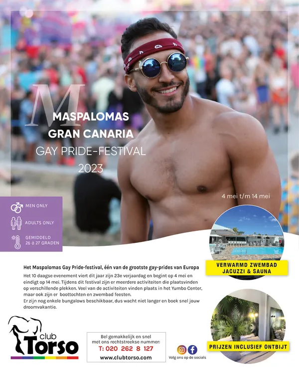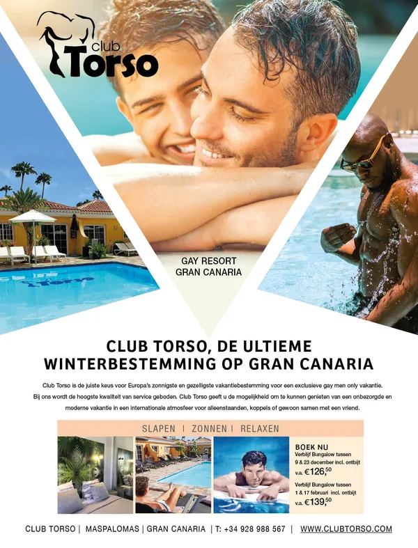 Welkom bij Club Torso, waar we met trots ons resort presenteren als dé perfecte gay bestemming. Deze pagina neemt je mee op reis door de schijnwerpers van verschillende media zoals Winq, Party en Weekend die ons resort in de spotlights hebben gezet. Of het nu gaat om het bruisende Maspalomas Gay Pride Festival, ontspannen vakanties in de winterzon of het dagelijkse comfort en de luxe die wij bieden, hier blijf je op de hoogte van de laatste nieuwtjes in de media.